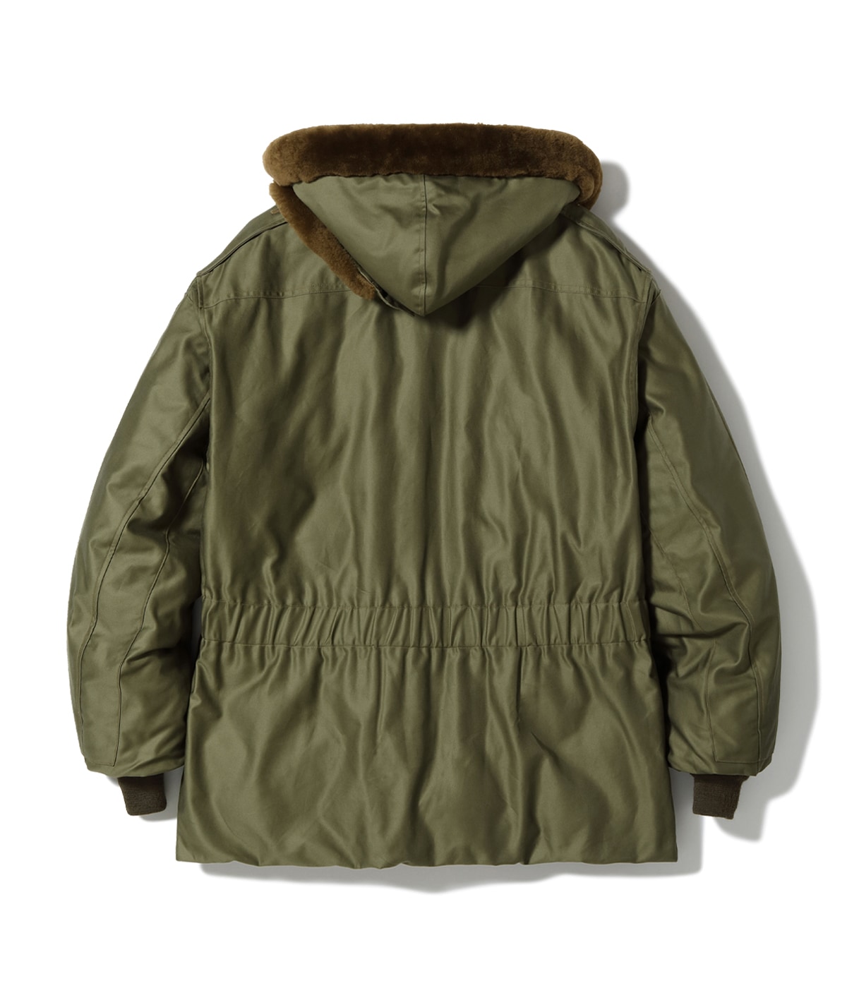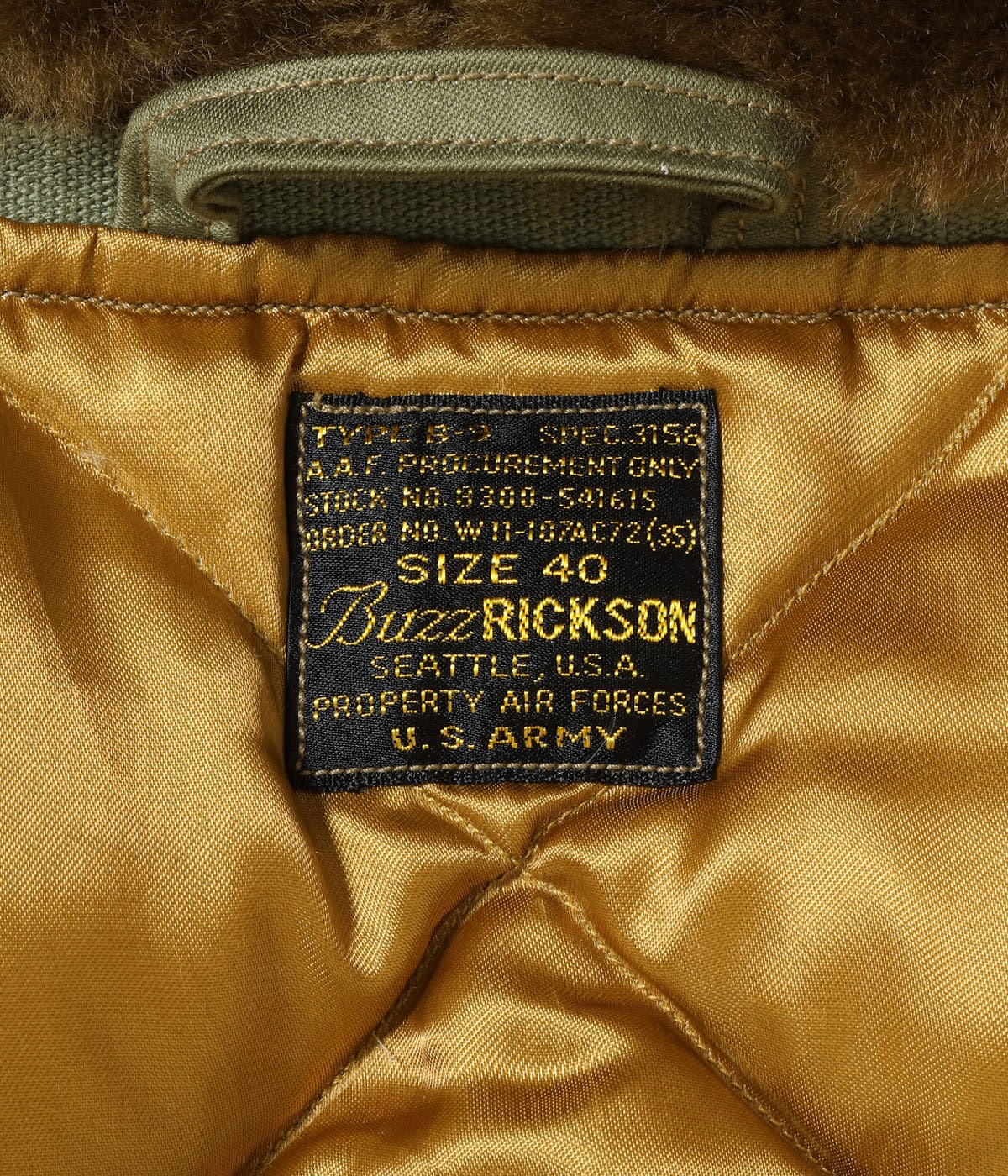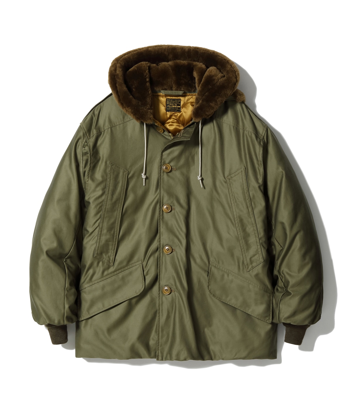 The Type B-9 is a winter flight jacket manufactured between 1943 and 1944. Its predecessor, the Type B-7 made of sheepskin, was replaced by the B-9 due to increased troop numbers and the urgent need for a more producible jacket during WWII. With difficulties in securing sheepskin, considerations of cost, productivity, and weight led to the development of the B-9. The outer shell is made of cotton twill, with a quilted lining filled with lightweight and highly insulating down. The interior lining is made of rayon for better mobility. The jacket’s design retains the basic appearance of the B-7, featuring a zipper and button closure at the front, a rubber waistband at the back, and ribbed cuffs to prevent wind intrusion.