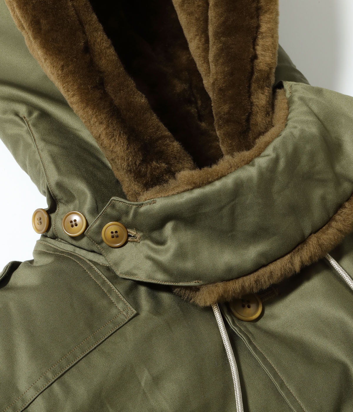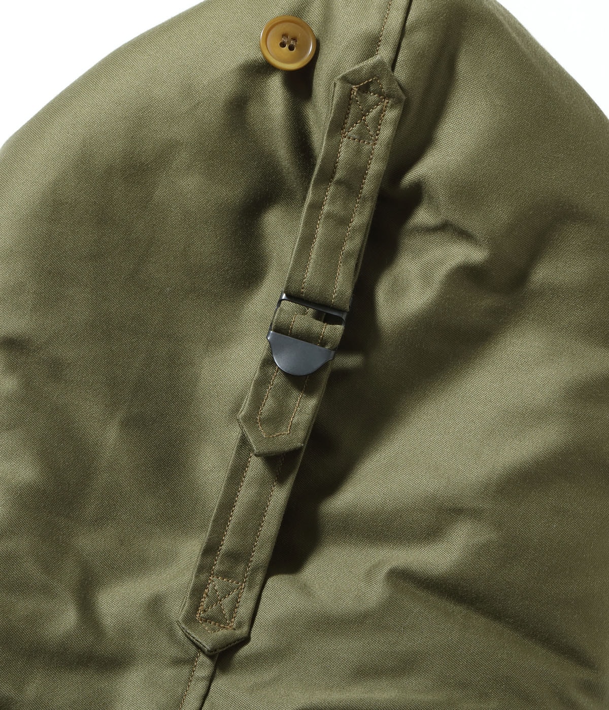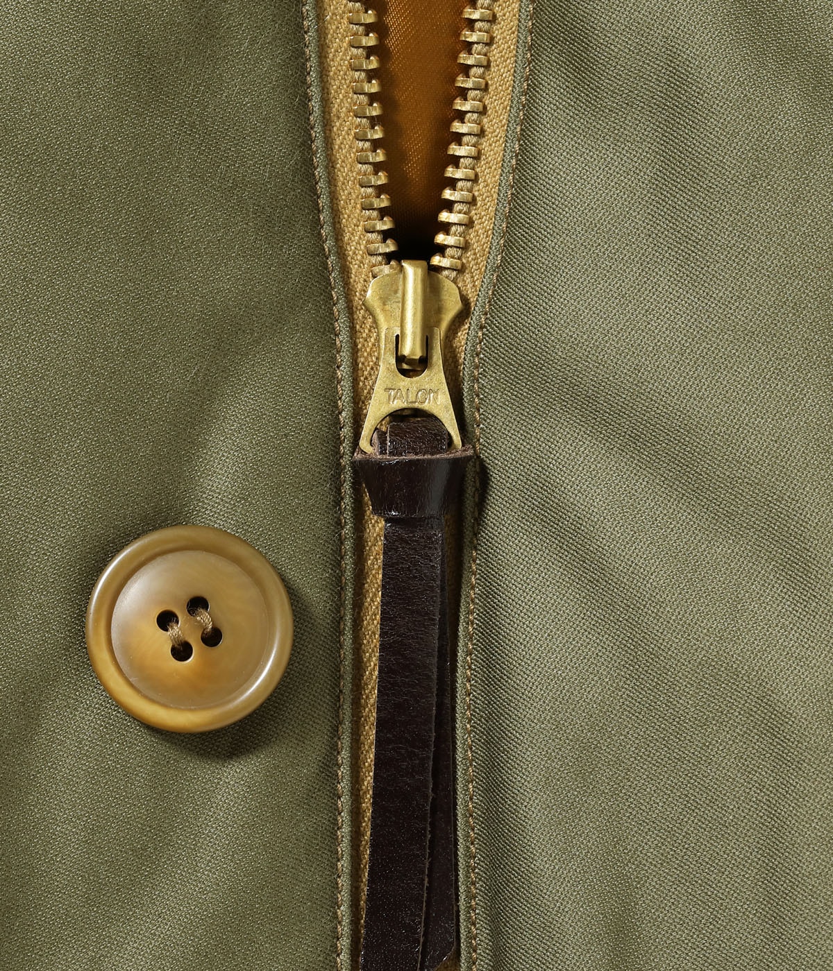 The Type B-9 is a winter flight jacket manufactured between 1943 and 1944. Its predecessor, the Type B-7 made of sheepskin, was replaced by the B-9 due to increased troop numbers and the urgent need for a more producible jacket during WWII. With difficulties in securing sheepskin, considerations of cost, productivity, and weight led to the development of the B-9. The outer shell is made of cotton twill, with a quilted lining filled with lightweight and highly insulating down. The interior lining is made of rayon for better mobility. The jacket’s design retains the basic appearance of the B-7, featuring a zipper and button closure at the front, a rubber waistband at the back, and ribbed cuffs to prevent wind intrusion.